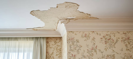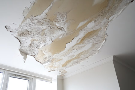 Damaged ceiling showing water leakage from a burst pipeline, highlighting a significant household problem with water damage.
