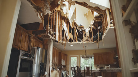 This image depicts a severely damaged kitchen ceiling caused by a water leak, showing structural collapse and debris scattered around.