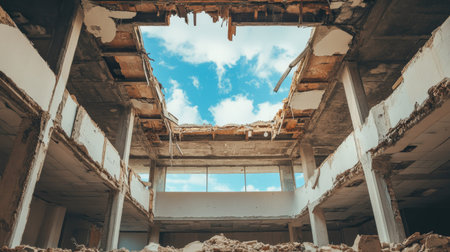 This striking image captures an abandoned building's interior, showcasing a demolished ceiling that reveals a vibrant blue sky with fluffy clouds, symbolizing urban decay.
