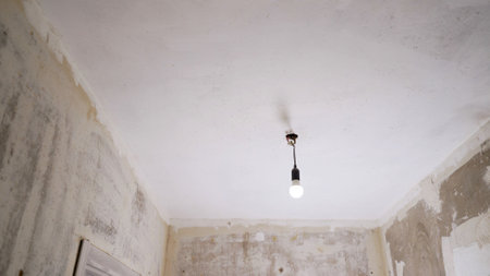 Single light bulb illuminates room during home renovation, highlighting the progress of the remodeling project