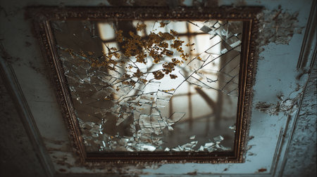 Broken mirror on the wall of an old building with a broken window