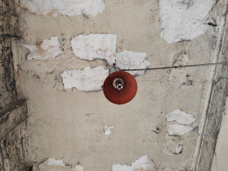Interior of the room with a broken wall and a ceiling lamp