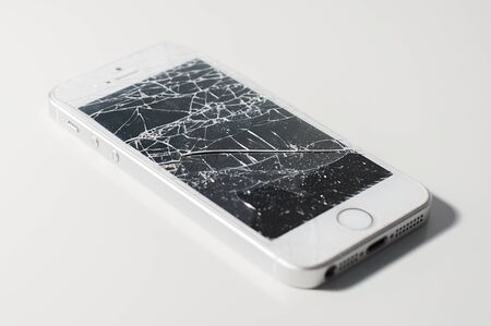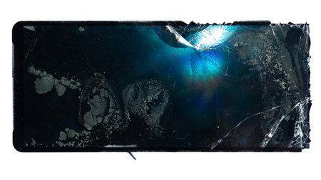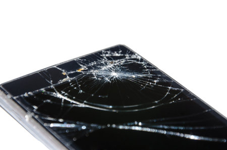 Top view at an angle on a mobile phone with a cracked screen, highlighted on a white background