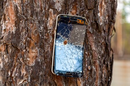 three pieces of an old disassembled smartphone with a broken black screen in cracks lie on a table on the street