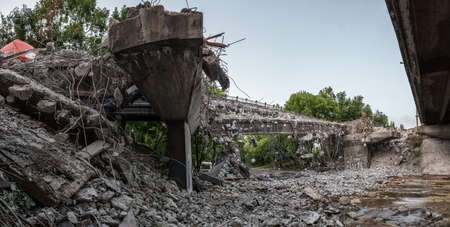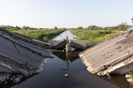 CHERNIHIV REG, UKRAINE - Jun. 19, 2022: War in Ukraine. Blown up bridge as a result of the invasion of Russian war criminals. Landscapes of Ukraine after the invasion of Russian fascists