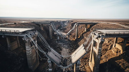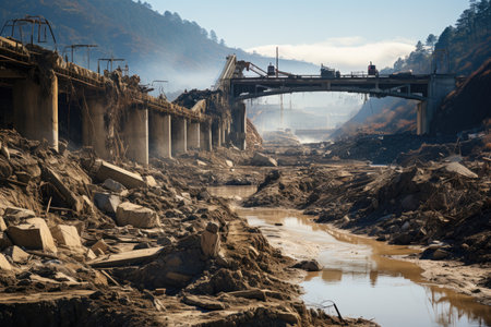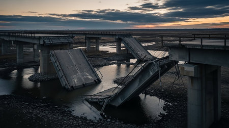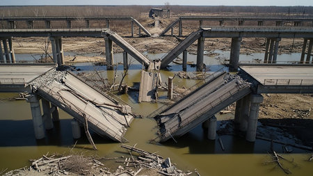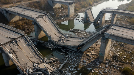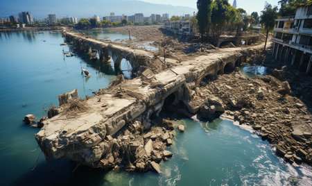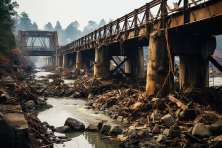 Debris showing devastated concrete bridge collapsed and broken over a river with debris scattered around showcasing destruction and aftermath of an event keywords:...