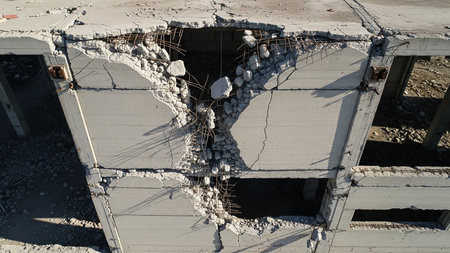 Aerial showing close up aerial view of a heavily damaged concrete building structure with exposed steel rebar and debris showing the devastation of destruction or...