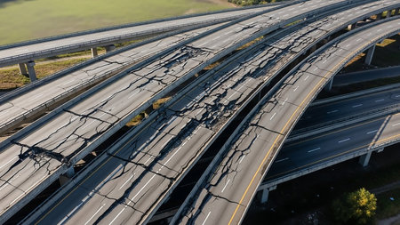 An aerial view a multi-level highway overpass heavily damaged with extensive cracks and collapsed sections, indicating a severe disaster.