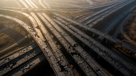 Roads showing extensive network of cracked and damaged elevated highway overpasses stretching across a vast landscape under a hazy, golden sunrise light showcasing...