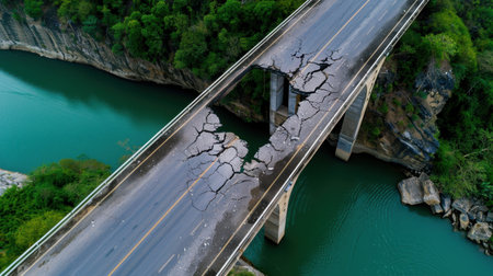 An aerial perspective reveals a cracked bridge spanning over vibrant turquoise water, surrounded by green foliage. This image highlights infrastructural challenges.