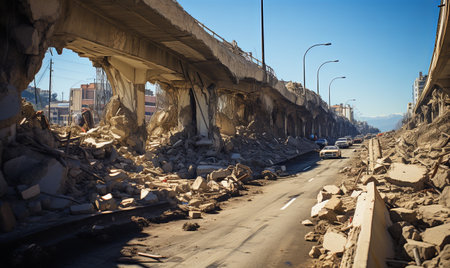 Damaged houses and road after the strong earthquake. AI generated.