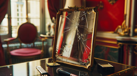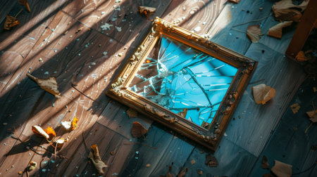 Close-up of a shattered antique mirror with an ornate golden frame, broken glass pieces scattered around.