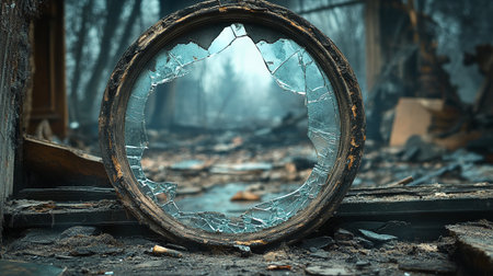 A broken, ornate antique mirror lies among rubble, its glass shattered and covered in dust, evoking a haunting and abandoned atmosphere.