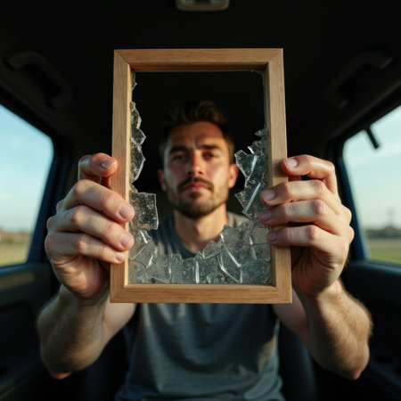 A man in a car holds a broken mirror frame to the camera.