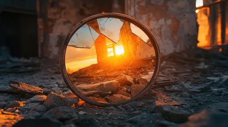 An evocative image capturing the reflection of a sunset in a broken mirror surrounded by an abandoned structure, symbolizing beauty amidst decay.