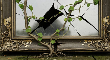 A close-up of a broken vintage mirror frame with intricate details and cracked glass, evoking a sense of nostalgia and decay.
