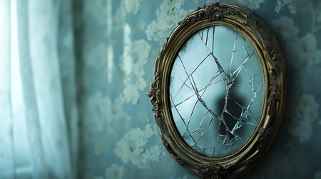 Close-up depicts a broken mirror in an elaborate round gold frame against a floral wallpaper backdrop, emphasizing fragility.