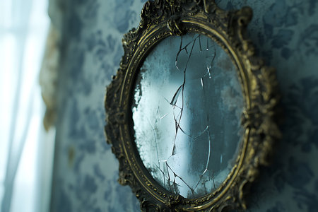 close-up shot of a broken antique mirror, created with generative ai