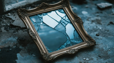 A broken mirror sits on a wall, reflecting scattered shards and the surrounding environment, A mirror reflecting shattered and distorted images, AI Generated