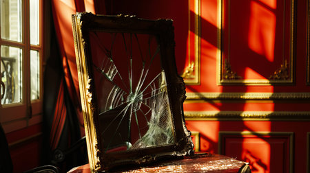A shattered ornate mirror with a vintage frame against a dark background. This striking image evokes emotions of fragility and perception, perfect for artistic themes.