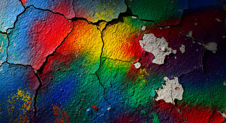 A colorful, cracked wall with yellow, blue, and red splatters. The wall appears to be in a state of disrepair, with paint peeling and chipping away