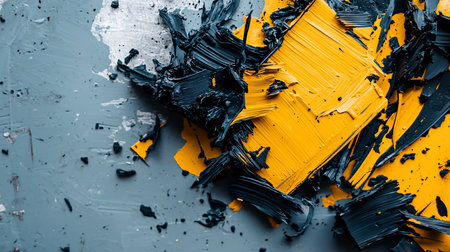Close-up of thick yellow and black paint strokes on a textured gray surface, creating a dynamic abstract composition with contrasting colors and textures.