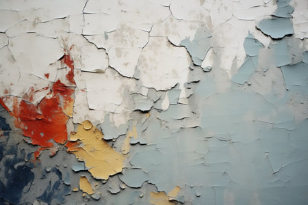 Aged wall with colorful peeling pieces of paint. Abstract wallpaper background. Created with Generative AI
