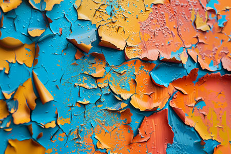 This close-up image showcases a weathered surface with vibrant blue and orange colors, revealing intricate peeling paint patterns. Perfect for artistic projects.