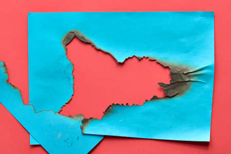 Burnt hole in turquoise and red paper with burned edges, flat lay with copy-space