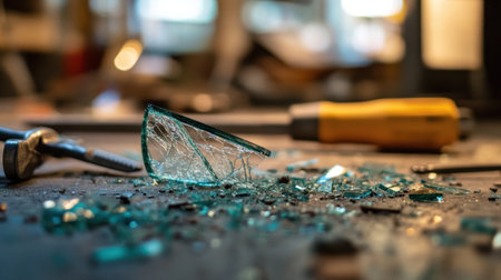 Detailed image of shattered glass pieces scattered across a workshop table, surrounded by tools and a soft-focused background, depicting a moment of chaos in a creative space.