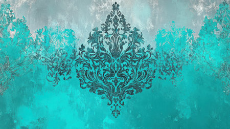 A seamless pattern with a digital painting of turquoise damask, its surfaces reflective and mesmerizing. Art Deco meets Modern Luxury, with a minimalist design and metallic sheen. The background is a muted teal, sky blue, and gray. There is no text or imagery in the center of the canvas, only monochromatic soft grays and gentle blues. The design incorporates ocean green and misty gray, using a watercolor technique. --chaos 30 --ar 16:9 --v 6.1 Job ID: b5ae1f46-c447-41b9-941c-c300fb619dfa