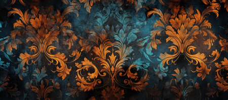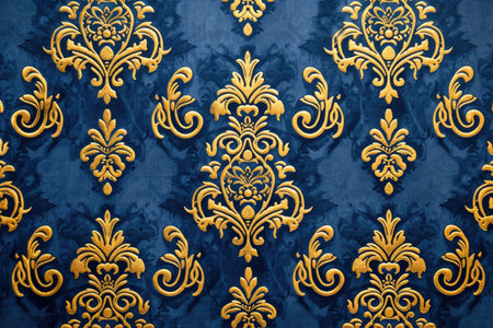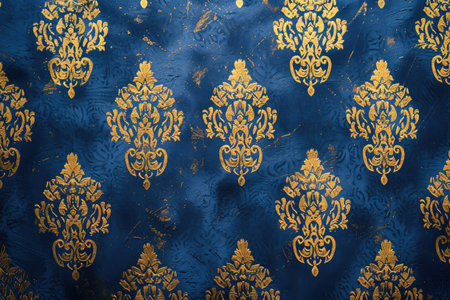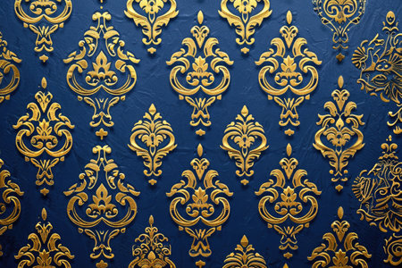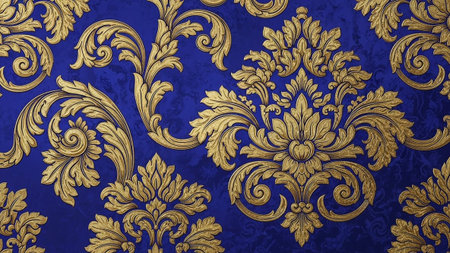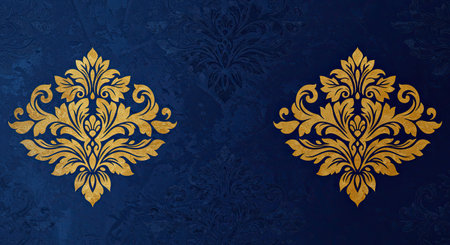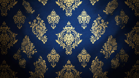 Elegant baroque-inspired digital artwork featuring intricate damask motifs in rich navy and gold palette, capturing a luxurious vintage mood with sophisticated lighting effects. Ideal for upscale interior decor, luxury fashion textiles, premium packaging, and elegant branding projects targeting high-end clientele. The opulent floral designs and detailed artis... AI-generated digital illustration. AI-generated illustration.