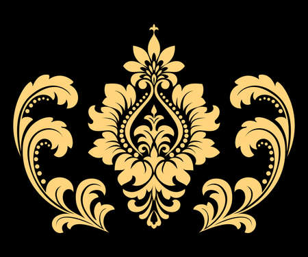 Golden vector pattern on a black background. Damask graphic ornament. Floral design element.