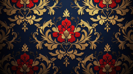 An elegant vintage floral pattern featuring vibrant red flowers and rich gold details on a dark blue background, perfect for textiles and home decor.