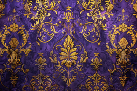 This image features a stunning damask pattern in rich purple and gold tones, ideal for various applications in interior design and textile projects.