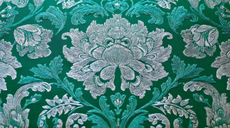 Opulent decorative background of green damask fabric, intricate floral motifs, fine woven craftsmanship and sheen