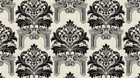A black and beige damask pattern is presented, distinguished by the integration of architectural such as columns and arches alongside ornate floral motifs. The is intricate, detailed, and repeats seamlessly, offering a classic and traditional aesthetic with hints of baroque or rococo influence. This versatile pattern is well-suited for applications like wallpaper, fabric, or as a decorative background, conveying a sense of luxury and historical elegance.