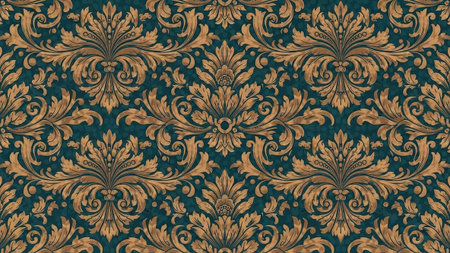presents a gold damask pattern featuring intricate floral scrolls and detailed leaf motifs on a deep teal backdrop. The is characterized by its symmetry, repeating nature, and seamless creating a rich and opulent texture. It embodies a classic, vintage aesthetic, high-end decorative uses.