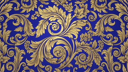 A highly detailed and ornate baroque pattern featuring swirling golden floral motifs set against a deep, rich blue background. The is intricate and symmetrical, evoking a sense of luxury and classic elegance. This seamless pattern is use as wallpaper, fabric, or a decorative background. The contrast between the vibrant gold and the deep blue creates a striking visual effect.