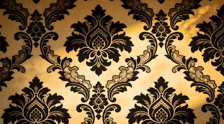 Immerse in the sophisticated allure of intricate lace-like damask patterns in deep black hues, bathed in soft golden hour lighting to evoke a vintage opulent ambiance. This artistic design excels in luxury wallpapers, high-end textiles, elegant invitations, and premium packaging solutions. Perfect for interior designers, fashion creators, and branding experts... AI-generated digital illustration. AI-generated illustration.