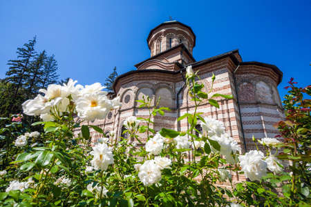 Cozia Romania Septemper 2 2012: White roses flowers in front of Cozia monastery church on a sunny summer day Romania