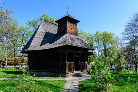 Bucharest, Romania - 25 April 2021: Old traditional Romanian church surounded with many old trees and green grass in Dimitrie Gusti National Village Museum in Herastrau Park in a sunny spring day