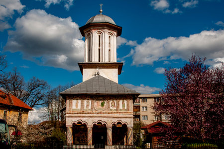 View of beautiful, old monastery in Targoviste, Romania, on a cloudy autumn day