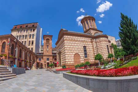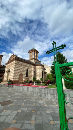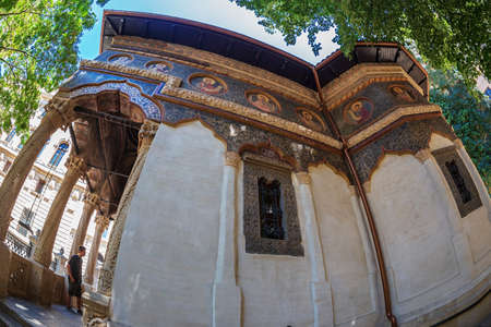 BUCHAREST, ROMANIA - JULY 16, 2018: Stavropoleos monastery, founded in 1724 by the Greek monk Ioanikie Stratonikeas, a masterpiece of Brancovan architectural style.