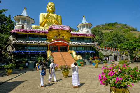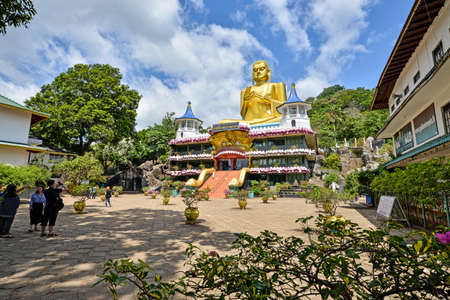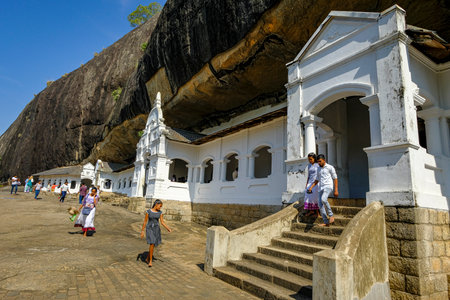 Dambulla, Sri Lanka - February 2020: People visiting Golden temple of Dambula on February 8, 2020 in Dambulla, Sri Lanka.