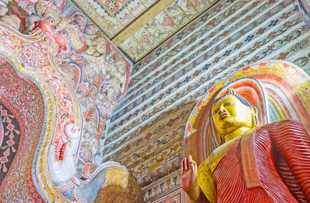 Buddha statue and fresco in the Buddhist cave temple in Dambulla, Sri Lanka