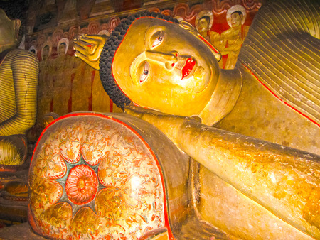 Dambulla cave temple also known as the Golden Temple of Dambulla is a World Heritage Site in Sri Lanka. Buddha statue, side view.
