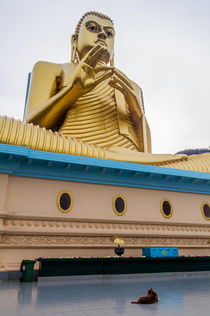 DAMBULLAH, SRI LANKA - FEBRUARY 08, 2020: At the entrance to the ancient Buddhist temple Rangiri Dambulu Raja Maha Viharaya (golden temple)
