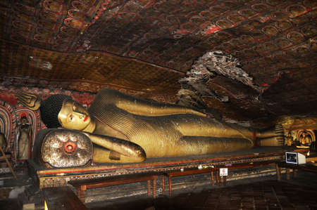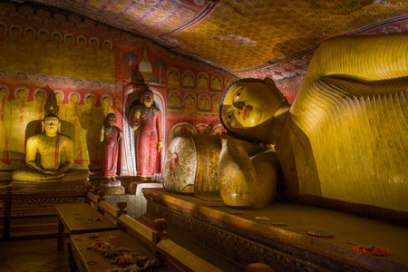 Ancient statue of a reclining Buddha in a cave Buddhist temple Rangiri Dambulu Raja Maha Viharaya (Golden Temple). Dambulla, Sri Lanka