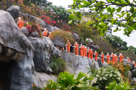 DAMBULLA, SRI LANKA - FEBRUARY 27, 2014: Buddhist monk statues at Golden Temple. It is is the largest, best-preserved cave-temple complex in Sri Lanka listed as UNESCO World Heritage site.